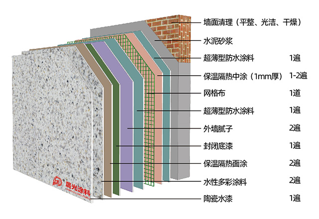 墙面清理→J9国际站登录CPX薄型防水→CHG建筑用涂装系统的保温隔热中涂→压入耐碱玻纤网格布→J9国际站登录CPX薄型防水。