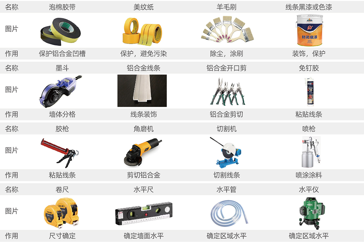 选择项目需要的铝合金线条(U型,单槽,双槽,八字格,T十字接头,阳角等),沿墨斗线安装铝合金线条,选择质量好的粘胶剂免钉胶,铝合金线条粘贴于墨斗线下方; 一般先贴阴阳角,后贴平面,用同等宽度的泡棉胶带保护铝合金条,方便后期施工,不需要清理槽内浆料。